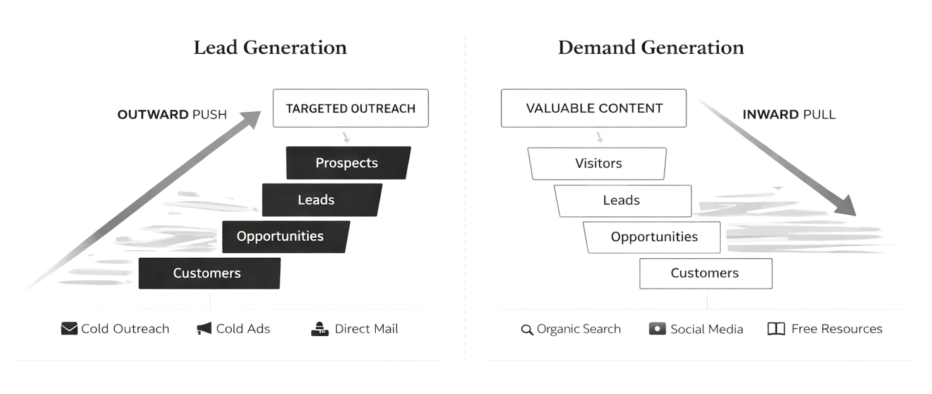 Figure 4.1: Structural Distinction. Lead generation pushes outward through direct outreach, capturing prospects at various stages. Demand generation pulls inward through valuable content, attracting prospects as they self-educate.