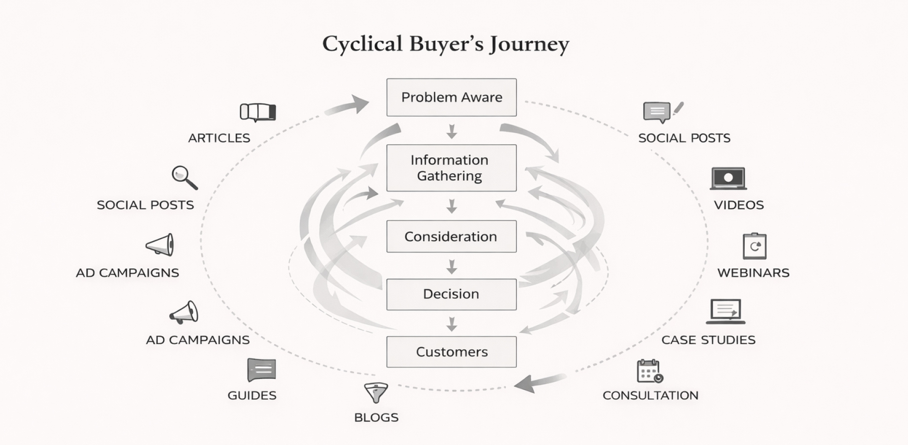 Effective demand generation requires understanding the buyer's journey in its cyclical reality, not its linear simplification. Buyers advance, retreat, and return. Content must be available for every stage, accessible whenever the buyer needs it.