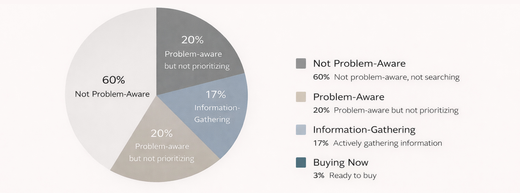 Figure 4.4: Market Assumptions. At any moment, a target market distributes across awareness stages. Approximately 60% are not problem-aware, 20% are problem-aware but not prioritising, 17% are actively gathering information, and 3% are ready to buy. These are called market assumptions because they describe probabilistic distributions observed repeatedly across markets, not certainties about any individual buyer. The exact proportions may vary by industry, timing, and context, but the underlying pattern remains stable: only a small minority of the market is in an active buying state at any given time. Effective growth systems are designed around this reality rather than optimised exclusively for the smallest, most visible segment.